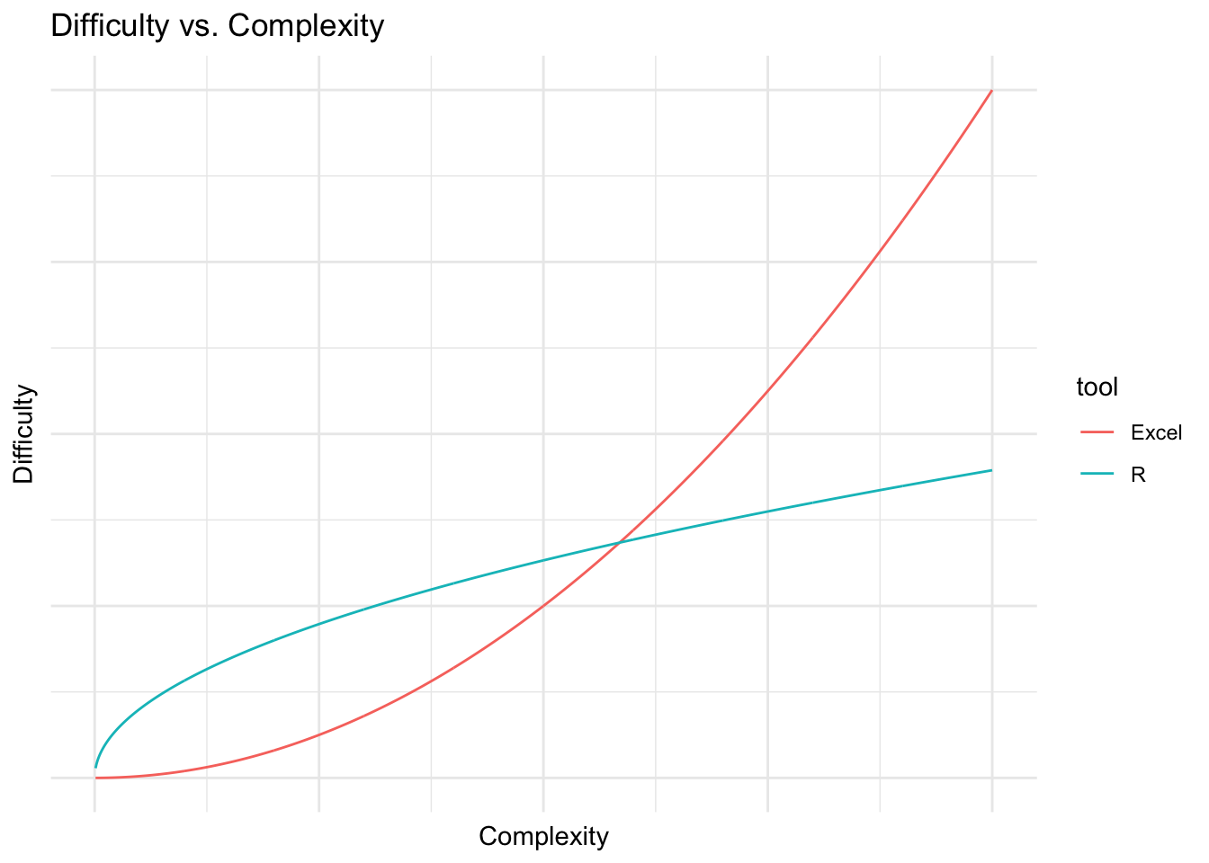 This is the basic pain of learning to program. Programming languages are designed to be general in their application and to allow you to accomplish a huge variety of complex tasks with the same basic set of tools. The cost of this generality is a steep learning curve. When you start learning to do basic tasks in R, you are also learning how to do complex things down the road. As you learn more and more, the marginal cost of complex analyses goes down. Excel is the opposite, and is very easy at the beginning, but the marginal cost goes up with the complexity of the problem. If you were to graph this it might look like this: